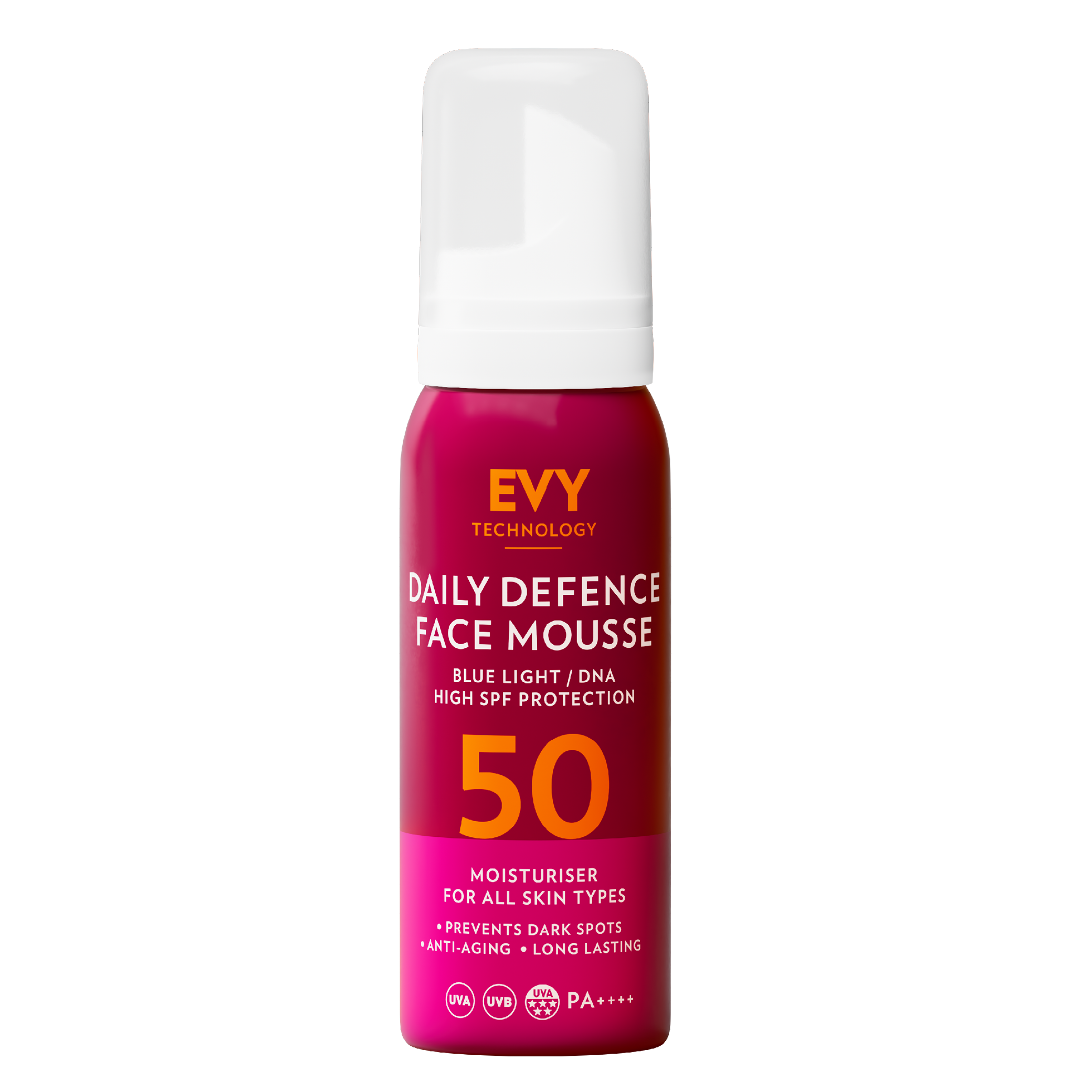 Täglicher Schutz vor UV- und HEV-Strahlung. Ein intensiv feuchtigkeitsspendender Anti-Aging-Gesichtsschaum, der die Schutzbarriere der Haut stärkt und vorzeitigen Anzeichen von Hautalterung und Hyperpigmentierung vorbeugt. Die aktive Hautpflegetechnologie in Kombination mit den Wirkstoffen bietet der Haut lang anhaltenden und wirksamen Schutz vor UV-Licht und freien Radikalen, die durch Sonne und Umweltverschmutzung entstehen können. EVY ist leicht und hinterlässt keinen weißen Film oder verstopft die Poren. Er eignet sich ideal als Primer unter dem Make-up, da er auch vor Hautirritationen durch Kosmetika schützt. Funktioniert gut allein oder in Kombination mit leichten Hautpflegeprodukten. EVY ist für alle Hauttypen geeignet und kann auf der Kopfhaut und bei dünnem Bart verwendet werden. Die sanfte, allergiegetestete Formel ist auch für Menschen mit Ekzemen oder Akne geeignet. Verstopft die Poren nicht und hinterlässt keine weißen Rückstände. Frei von Konservierungsstoffen und Parfüm. Keine Nanopartikel. Vegan.